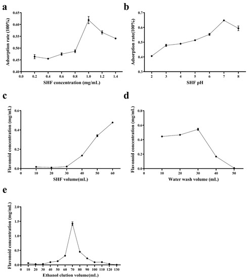 We investigated SHF separation conditions and the effects of various factors in adsorption chromatography. The effects of loading solution concentration, pH, and volume on DM301 adsorption rate are shown in Figure 3a–c, and the determinations of water wash volume and ethanol elution volume based on flavonoid concentration are shown in Figure 3d,e.