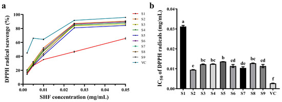 DPPH radical scavenging abilities of nine SHFs: (a) DPPH radical scavenging abilities of nine SHFs within concentration range 0.002–0.05 mg/mL; and (b) IC50 for DPPH radicals. Differing letters above bars indicate significant (p < 0.05) differences according to Tukey’s multiple comparisons test.