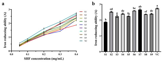 Iron reducing abilities of nine SHFs: (a) iron reducing abilities of nine SHFs within concentrations range 0.05–0.4 mg/mL; and (b) iron reducing ability of flavonoids at a concentration of 0.4 mg/mL. Differing letters above bars indicate significant (p < 0.05) differences according to Tukey’s multiple comparisons test.