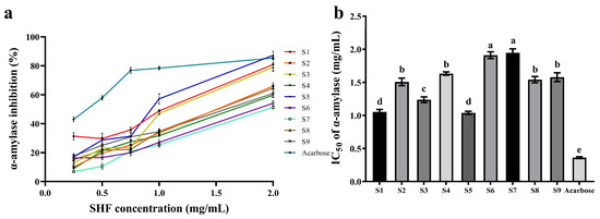 α-AI activities of nine SHFs: (a) α-AI activities of nine SHFs within concentration range 0.25–2 mg/mL; and (b) IC50 of α-amylase. Differing letters above bars indicate significant (p < 0.05) differences according to Tukey’s multiple comparisons test.