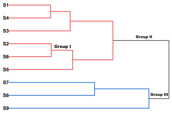 High performance liquid chromatography fingerprint analysis has been widely used in study of Chinese medicinal material composition [39,40]. In this study, we used HPLC fingerprint analyses to compare the components of flavonoids. HPLC fingerprint analyses of the nine SHFs was performed (Figure 7), and the results were evaluated using the Chinese medicine fingerprint similarity evaluation system (Table 5). Similarity values were high: 0.60, 0.90, 0.89, 0.88, 0.79, 0.94, 0.91, 0.91, and 0.97 for strains S1–S9, respectively. Cluster analysis, a method for analyzing and simplifying datasets, is useful for highlighting similarities and differences among data points [41]. Peak areas from the chromatograms in Figure 7 were subjected to cluster analysis using the OriginPro analysis tool. Results (Figure 8) led to clustering of strains into three groups: group I (S2 and S6), group II (S1, S2, S3, S4, and S5), and group III (S7, S8, and S9). Strains S2 and S6 in group I were from Shaanxi (see Section 2.1). Group II strains were from parasitic fruiting bodies on mulberry trees, while group III strains were from parasitic fruiting bodies on lacquer, tyrannical horse butternut, or poplar trees. Differential SHF composition among strains was evidently associated with geographic origin and with host species.