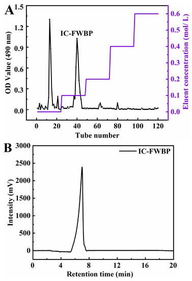 The medium pressure column was selected for column loading, which was continuously balanced for 12 h with distilled water. A portion of the crude polysaccharide sample (20 mg/mL) was loaded onto a pre-equilibrated cellulose DEAE-52 column (1.6 cm × 300 cm) and sequentially eluted with distilled water and 0.1, 0.2, 0.4 and 0.6 M sodium chloride solutions at a flow rate of 1.0 mL/min. The automatic collector collects 5 mL for each tube and 24 tubes for each concentration. The polysaccharide content of each tube was analyzed using the phenol-sulfuric acid method at 490 nm [17]. The polysaccharide solution was dialyzed against a dialysis bag (Genview, Tallahassee, Florida, USA) of 100 kDa for 48 h to remove small molecule impurities and then freeze-dried for 48 h to collect the IC-FWBP fraction.