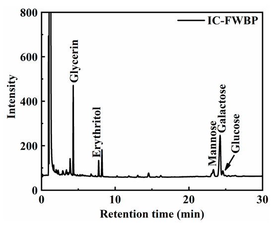 The periodate oxidation result showed that the IC-FWBP consumed sodium periodate and released formic acid, suggesting the existence of (1→) or (1→6)-linked glycosidic bonds. The consumption of sodium periodate was more than twice the amount of formic acid, indicating the existence of one or more (1→2), (1→4), or (1→6)-linked glycosidic bonds [25]. The Smith degradation result of the IC-FWBP is shown in Figure 2. The presence of glycerol indicates the existence of (1→2) or (1→6)-linked glycosidic bonds [26]; erythritol, (1→4) or (1→4,6)-linked pyranosidic bonds or (1→5) or (1→5,6)-linked furanosidic bonds [27]; monosaccharides (mannose, galactose, and glucose) indicates (1→3), (1→3,6), (1→2,3), (1→3,4), (1→2,4), (1→2,3,4) or (1→2,3,6)-linked glycosidic bonds [28]. Several glycosidic bonds were precisely confirmed by the methylation and NMR spectral analyses.
