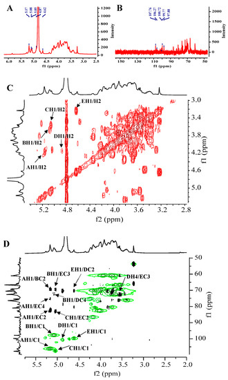 In the 1H-1H COSY spectrum (Figure 3C), the α-anomeric proton of residue A was located at δ 5.17 ppm. δ 5.17/δ 4.18 was attributed to the H1/H2 correlation of the T-β-D-Glcf residue. Thus, the proton correlations of the IC-FWBP were noticed in Table 3. The 1H-13C HSQC spectrum (Figure 3D and Figure S2) shows five pairs of 1H and 13C signals of anomeric H/C, which are caused by five different glycosidic bonds. The proton correlations of IC-FWBP were also noted in Table 3. According to the chemical shifts of protons and relevant HSQC correlations, the signals δ 5.17/106.27 (AH1/C1), δ 5.08/97.88 (BH1/C1), δ 5.05/107.76 (CH1/C1), δ 4.87/100.72 (DH1/C1) and δ 4.62/99.77 (EH1/C1) were detected, suggesting five sugar residues existed in the IC-FWBP. In agreement with the methylation result as well as 1H, 13C, and COSY analyses, residues A–E were assigned as T-β-D-Glcf, 1→2-α-D-Manp, 1→5,6-β-D-Galf, 1→2,3,4-α-D-Galp and 1→2,3,4-β-D-Manp, respectively.
