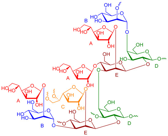The 1H-13C HMBC spectrum (Figure 3D and Figure S3) showed the correlations of five sugar residues in the IC-FWBP as follows: AH1/BC2 at δ 5.17/69.10, BH1/EC3 at δ 5.08/72.39, CH1/EC2 at δ 5.05/83.03, EH1/DC2 at δ 4.62/70.23, DH4/EC3 at δ 3.53/72.39, AH1/EC4 at δ 5.17/75.69, AH1/EC2 at δ 5.17/83.03 and BH1/DC4 at δ 5.08/71.82. The structure of the IC-FWBP contained a backbone made up of 1→2-α-D-Manp, 1→2,3,4-α-D-Galp and 1→2,3,4-β-D-Manp. The branching substitute was composed of T-β-D-Glcf and 1→5,6-β-D-Galf. Summed up, the inferred structure of the IC-FWBP is illustrated in Figure 4.