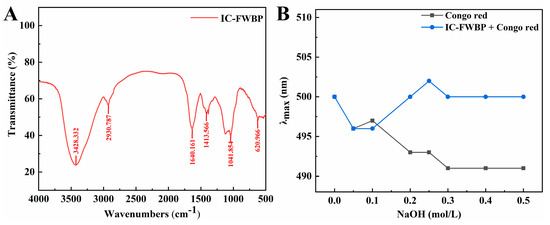 The functional groups of the IC-FWBP were analyzed by FTIR spectroscopy. As shown in Figure 5A, the strong and broad absorption peak at 3428 cm−1 corresponded to the OH stretching vibrations, and the weak absorption peak at around 2930 cm−1 was attributed to the C-H stretching vibrations of alkyl groups in the IC-FWBP, which were two typically characteristic absorptions of polysaccharide. The absorption peaks at 1640 cm−1 and 1413 cm−1 of the IC-FWBP were ascribed to the C=O and C=C stretching vibrations, respectively [36]. The IC-FWBP presented stronger absorption at 1640 cm−1, confirming the existence of the uronic acid in the IC-FWBP, which was consistent with the result of the chemical composition analysis in Table 1.