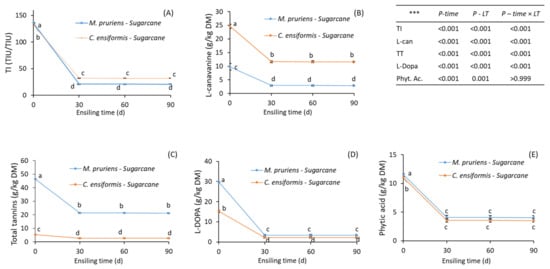 Effect of ensiling process on PSM concentrations (A) TI (trypsin inhibitor), (B) L-canavanine, (C) Total tannins, (D) L-dopa, and (E) Phytic acid] of mixed C. ensiformis–sugarcane and M. pruriens–sugarcane silage. *** upper right table: L-can (L-canavanine), TT (total tannins), Phyt. ac. (Phytic acid), P—time (p-value of the ensiling time), P—LT (p-value of the legume type), and P—time × LT (p-value of the interaction of ensiling time × legume type). Different superscript (a,b,c,d) show statistical differences to p ˂ 0.05 [].