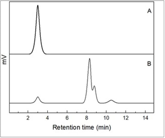 Chromatogram of HPLC analysis of citrus peel pectin (A) and hydrolyzed citrus peel pectin (B) with Pectinex Ultra AFP in a concentration of 1.25 µL/g.