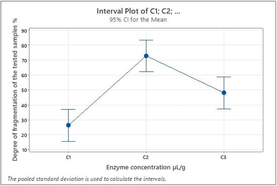 Figure 2 shows an interval plot of enzyme concentration comparing confidence intervals. It can be observed that the degree of fragmentation varies for each enzyme concentration when the other parameters (temperature and time) change.