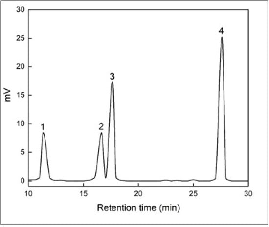 This hydrolyzed sample was further analyzed to determine the composition of monosaccharides. To evaluate the qualitative and quantitative monosaccharide composition of citrus peel pectin POS, each monosaccharide standard was analyzed, and calibration curves were generated by analyzing five points in the range 0.1–1.8 mM. The HPLC analysis of the hydrolyzed sample revealed the presence of four monosaccharides, as shown in Figure 3.