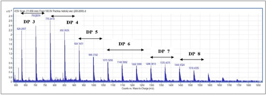 The average degrees of polymerization at the peaks (DP3-DP8) can be noted.