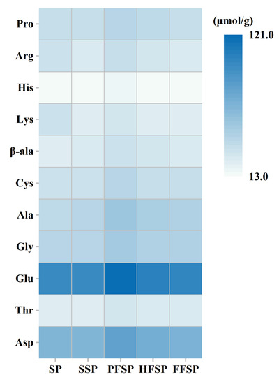 The heat map summarized the overall changes in amino acid composition for different SPs (Figure 1). The changes in the amino acid content of different SPs are shown in Table S1. Compared to SP, the total free amino acid concentration of SSP increased slightly. The autoclaving process did not cause significant amino acid loss. However, basic amino acids such as Lys and Arg decreased slightly, which could be related to the extent of the Maillard reaction [30]. These amino acids may also be destabilized by the acidic conditions related to fermentation [16]. Total free amino acid concentration increased significantly during fermentation. This change mainly contributed to an increase in the concentrations of Asp, Thr, Glu, and Ala. These free glucogenic amino acids (alanine, aspartic acid, and glutamic acid) can be involved in gluconeogenesis [29], which may partly explain the increase in total sugars. It is also possible that the rate of protein hydrolysis exceeded the rate of amino acid catabolism, resulting in an increase in free amino acids after fermentation. Notably, the concentration of glutamate and aspartic acid increases significantly after fermentation (PFSP), by 23.29% and 23.16%, respectively. This may be due to their presence as the main amino acids in edible mushrooms. Glutamic acid and aspartic acid are natural umami amino acids that can be used to enhance the flavor of low-salt foods. Moreover, the increase in amino acids during fermentation is attributed to the hydrolysis of proteins into free amino acids by microbial enzymes [30]. In contrast, the amino acid content of PFSP increased more obviously. During the fermentation process, the synthesis and utilization of free amino acids by the mushrooms would cause changes in amino acid content and composition [31]. According to the study by Zhao, et al. [32], P. ostreatus and other edible mushrooms can use okara protein as a nitrogen source to generate more free amino acids.