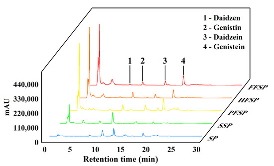 Liquid chromatogram of soybean isoflavones in different soybean meal powders. SP: soybean meal powder; SSP: sterilized soybean meal powder; PFSP: Pleurotus ostreatus fermented soybean meal powder; HFSP: Hericium erinaceus fermented soybean meal powder; FFSP: Flammulina velutipes fermented soybean meal powder.