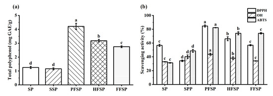 Changes in total polyphenol content (TPC) and antioxidant activity during the fermentation of different soybean meal powders. (a) Total polyphenol content; (b) scavenging activity. SP: soybean meal powder; SSP: sterilized soybean meal powder; PFSP: Pleurotus ostreatus fermented soybean meal powder; HFSP: Hericium erinaceus fermented soybean meal powder; FFSP: Flammulina velutipes fermented soybean meal powder. Data are mean ± SD of triplicates, values with different letters (a–d) present significant difference (p < 0.05).