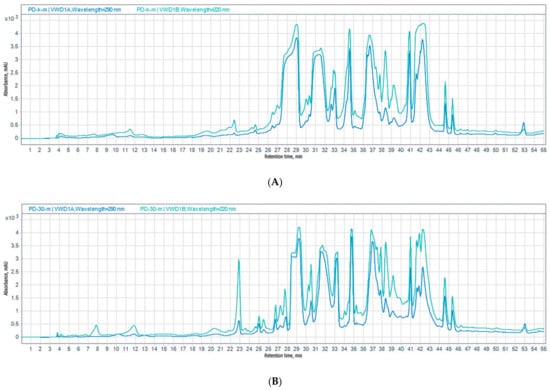 HPLC UV was carried out on an Agilent 1260 Infinity II chromatograph with a UV detector Agilent 1260 VWD (Agilent Technologies, Waldbronn, Germany) using a Supelco Discovery C-18 analytical column (5 μm, 4.6 mm × 250 mm) in a methanol/water gradient (20% MeOH—10 min, 20–100% MeOH—30 min, 100–20% MeOH—5 min). Detection was performed at 220 and 290 nm. The extract concentration was 2 mg per 30 µL for injection. The flow rate was 0.8 mL/min. A qualitative and quantitative analysis of HPLC UV chromatograms was performed using Agilent OpenLab software (version 2.4). The obtained data were exported into MS Excel for further calculation of the number of peaks and their total area. Peaks with a relative area less than 1% were considered noise and were eliminated.