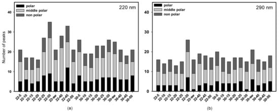 Total number of peaks in HPLC UV chromatograms. (a) Detection at 220 nm; (b) detection at 290 nm. The codes of extracts are presented in X axes of graphs.