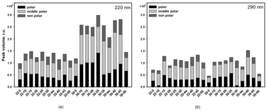 The change in the total area of the peaks with a change in the conditions for the fungus cultivation was especially noticeable in the polar zone. A decrease in the salt concentration at 22 °C led to slight fluctuations in the areas of these peaks, recorded at 220 nm. At the same time, a decrease in the salt concentration to 5–10 mg/mL at 22 °C led to a significant decrease in the areas of the peaks at 290 nm.