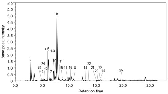 Metabolite dereplication was also carried out with an in-house MS/MS spectral library, comparing experimental spectra and retention times (RT) with the spectra and RT obtained for reference compounds 1–10 [].