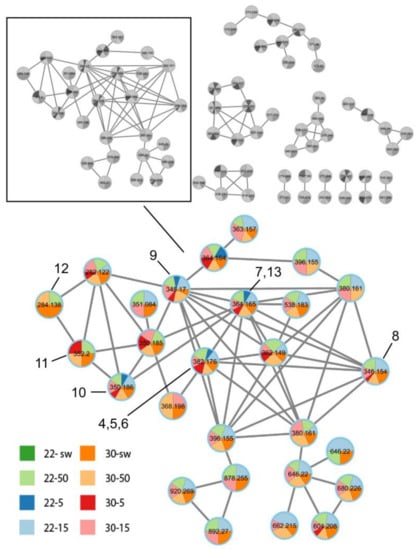 Feature-based molecular networking (FBMN) was generated with the pre-processed data on the Global Natural Products Social Molecular Networking (GNPS) website (https://gnps.ucsd.edu, accessed on 24 October 2022) [,]. The molecular networking module was used to visualize the molecular network. The precursor ion mass tolerance and fragment ion mass tolerance were both set to 0.02 Da. The network edges were set to have a cosine score of 0.4 or above, with a minimum of three matched peaks. The next parameters were also specified: minimum matched fragment ions and minimum cluster size were both set to 4. Other parameters were maintained as default. Annotation of the MS/MS spectra was carried out with the DEREPLICATOR tool. Visualization of the network was carried out with Cytoscape 3.9.1 [].