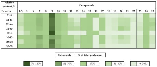 The heat map of a relative content of compounds 1–25 identified in fungal extracts. Each cell presents data about percentage of compound peak area to total area of peaks in extract.