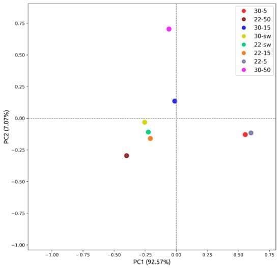 A change in the concentration of sea salt during cultivation at both 22 °C and 30 °C had no significant effect on the number of peaks in the non-polar region.