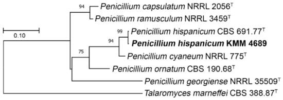 The ITS region sequences of members of the genus Penicillium section Ramigena series Ramigena and section Exilicaulis series Erubescens were aligned using the Clustal W algorithm. The ML tree of ITS region sequences was reconstructed based on the Tamura–Nei model [] and evaluated with 1000 bootstrap replicates.