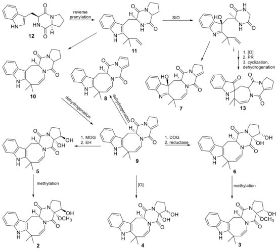 - Zhang, D.; Noviendri, D.; Nursid, M.; Yang, X.; Byeng, W.S. 12,13-Dihydroxyfumitremorgin C, fumitremorgin C, and brevianamide F, antibacterial diketopiperazine alkaloids from the marine-derived fungus Pseudallescheria sp. Nat. Prod. Sci. 2007, 13, 251–254. [Google Scholar]