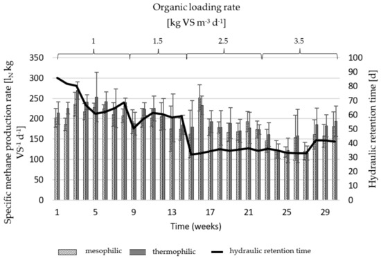 The results of the measurements of biogas and methane production at the four different loading rates (1.0, 1.5, 2.5 and 3.5 kg VS m−3 d−1) are summarized in Table 4 as well as in Figure 2.