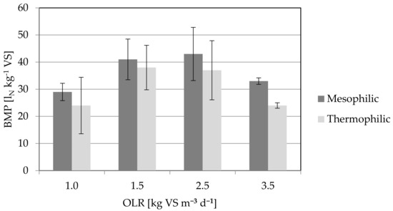 The results of the BMP test of the reactor residues under steady-state conditions are presented in Figure 3. The figure shows an increase in the BMP of the reactor residues up to an OLR of 2.5 kg VS m−3 d−1, which dropped at an OLR of 3.5 kg VS m−3 d−1. The BMPs of the residuals were higher under mesophilic conditions than under thermophilic conditions. This effect could be explained by the faster degradation of organic matter under the thermophilic condition [21]. Therefore, less undigested organic matter was released from the reactor outlet.