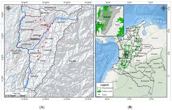 Geographic location of the study area in the Department of Quindío (A), in the central coffee zone of Colombia (B).