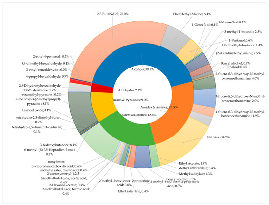 Regarding volatile organic compound determination, 45 compounds were identified in green coffee bean samples, which were grouped into 8 chemical classes: alcohols (9), esters (12), ketones (2), lactones (4), aldehydes (5), furans and pyrazines (5), amines and amides (5), and pyridines and pyrrolidines (3). Figure 2 shows the proportions of chemical classes and predominant compounds in green coffee samples (compound-specific values are presented in Table S2). The first five classes were products of microbial metabolism; the remaining three classes were products of thermal reactions in postharvest. Descriptive differences in compound proportions were identified, possibly associated with differences in fermentation types. Compounds, such as phenylethyl alcohol and methyl anthranilate, were present in all samples, while 2,3-butanediol, ethyl acetate, and 3-hydroxybutanone were only present in samples that received the highest SCA cupping scores. The high concentration of 2,3-butanediol was only found in sample F20 (Table S2).