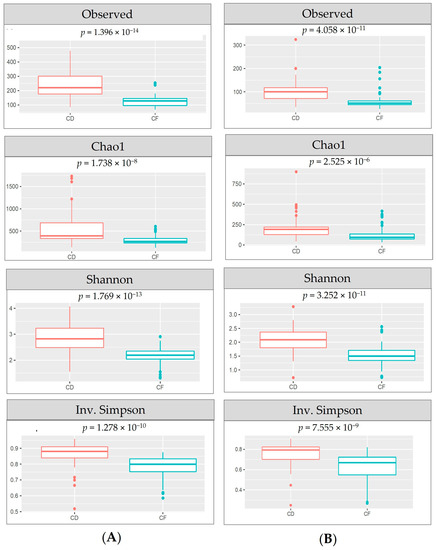 Boxplot of alpha diversity indexes, namely Observed, Chao1, Shannon, and inverse Simpson, for bacterial communities (A), as well as for yeast/fungal microbiota (B), for the two sample types. Samples are colored according to sample type: pink for samples at the beginning of fermentation—CD—and light blue for the end of fermentation—CF.