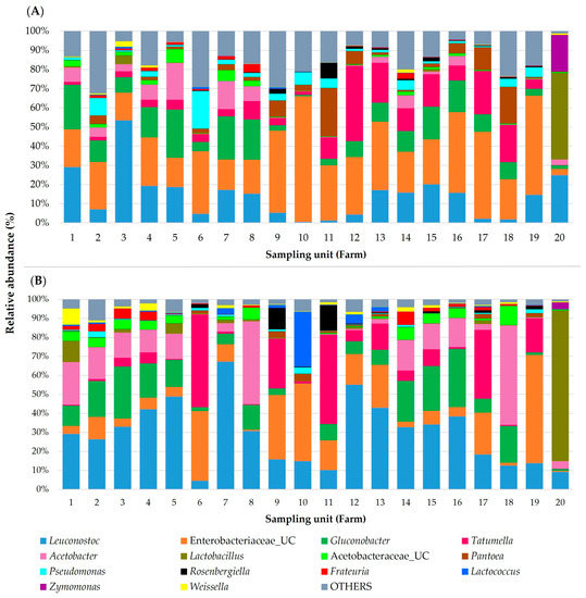 The relative abundance of predominant genera OTUs varied according to the sampling unit (farm), process, and sample types. In general, Leuconostoc, Acetobacter, Tatumella, and Lactobacillus genera populations increased at the end of fermentation, while there was a significant decrease in Enterobacteriaceae family OTUs compared to those identified at the beginning of this process. Data from samples collected in units 6 and 20 were highlighted, in which Tatumella and Lactobacillus populations increased from 4.1 to 48.9% and from 45.1 to 79.3%, respectively (Figure 4). By contrast, OTUs of Enterobacteriaceae family populations decreased in most samples at the end of fermentation (CF), from 26.7 to 15.3% on average (Figure 4B). Similarly, genera with a relative abundance classified in “Others” decreased their proportion to less than 3% on average, due to performed fermentations (Table S6).