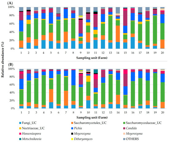 Figure 5 represents the relative abundance for 94.9% of the total ITS sequences, among which Pichia (13.2%), Candida (10.0%), and Hanseniaspora (1.8%) were identified at the genus level. The genera Meyerozyma, Wickerhamomyces, Metschnikowia, and Debaryomyces had less than 1% relative abundance. At the end of fermentation (Figure 5B), genera from the Saccharomycedaceae family predominated, as their relative abundance increased from 33 to 52%, on average, for all fermentations. Genera classified as “Others” decreased in all samples, at the end of fermentation, going from 7.9%, on average, to 2.2% (Table S6).