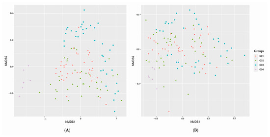 A Beta diversity analysis using the Bray–Curtis distance was performed to qualitatively estimate the presence of microbial patterns among samples (Figure 6). PERMANOVA analysis indicated significant statistical differences for both bacterial and fungal diversity (p < 0.05), and it showed four separate groups, which were characterized by differences in the relative abundance of the dominant genera. Leuconostoc dominated the first group (G01); Acetobacter, Gluconobacter, Leuconostoc, OTUs of the Saccharomycedaceae_UC family, and Pichia dominated the second group (G02); Enterobacteriaceae_UC, Tatumella, and Saccharomycedaceae_UC dominated the third group (G03); and Lactobacillus dominated the fourth group (G04). These groups were representative of a relationship with coffee quality, with G01 and G03 showing a clean cup, G02 showing a greater number of sensory defects, and G04 having higher SCA quality scores. The variability in what individuals contribute to quality, according to the groups, is explained by 35.1% and 13.6% of bacterial and fungal diversity, respectively, leaving unexplained a high percentage of variability in the four groups, which may be related to other factors that were not included in this study.
