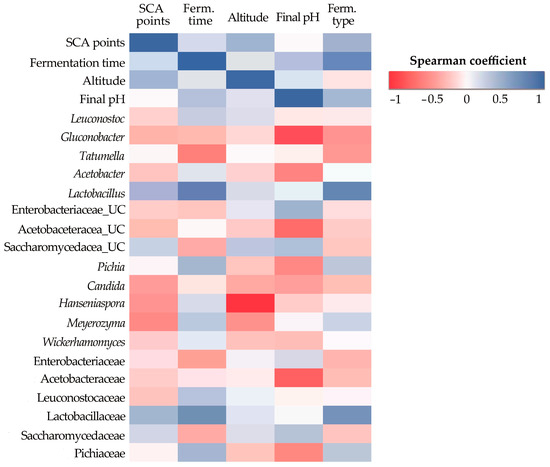 Relationships between different fermentation factors are represented by a heatmap of the obtained Spearman correlation coefficient values (Figure 7). Strong direct correlations are observed between Lactobacillus relative abundance, fermentation duration time, and fermentation type, with R2 = 0.826 and 0.771, respectively. An inverse correlation was observed between the crop´s altitude and the abundance of Hanseniaspora (R2 = −0.765). In general, with larger Gluconobacter, Acetobacter, Candida, Hanseniaspora, and Meyerozyma populations, moderate inverse correlations were observed with the SCA quality score, maintaining the behavior between families of these genera. It was also observed that the final fermentation pH had no influence on cup quality (R2 = 0.079), but lower pH values were related to a greater bacteria abundance, such as Gluconobacter (R2 = −0.62).