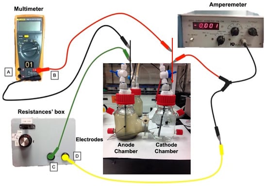 Experimental device: Lab-scale MFC. A: negative terminal of the multimeter; B: positive terminal of the multimeter; C: a terminal (-) that connects the resistance´s box to the MFC anode; D: a terminal (-) that connects the amperemeter to the resistance´s box; red cables: positive connectors from the multimeter and amperemeter to the MFC cathode; black cable: negative connector from the multimeter to the MFC node; yellow cable: negative connector from the amperemeter to the resistance´s box; green cable: negative connector from the resistance´s box to the MFC anode.
