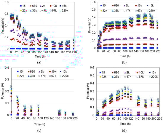 Effect of the external resistance (Ω) on the MFC potential. (a) Water and hydrophilically-treated graphene (DW-HTG); (b) HCl and hydrophilically-treated graphene (HCl-HTG); (c) Water and graphite (DW-G); (d) HCl and graphite (HCl-G).