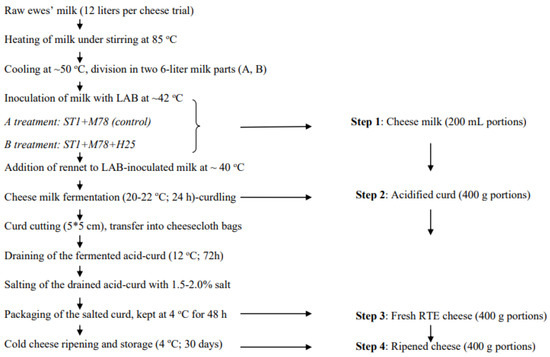 For each experimental cheese trial, 12 L of raw ewes’ milk obtained from local farmers was heated slowly in a stainless steel vessel at 85 °C over a gas burner under continuous stirring. The temperature was recorded with a probe thermometer. The milk vessel was then placed into a basin with cold running water to accelerate cooling. When the temperature fell to 50 °C, the milk was divided in two 6 L portions in two small (10 kg) plastic (trial 1) or stainless steel (trials 2 and 3) buckets with lids. At 42 °C, the milk was inoculated with appropriate volumes of fresh (24 h) LAB cultures in RSM to obtain approximate inoculation levels of 6.5 to 7.0 log CFU/mL for S. thermophilus ST1, 6.0 to 6.5 log CFU/mL for Lc. lactis subsp. cremoris M78, and 5.5 to 6.0 log CFU/mL for L. plantarum H25. In the first bucket, strains ST1 and M78 were added as the basic starter culture (ST1+M78; Galotyri A/control), whereas in the second bucket the H25 adjunct strain was added after inoculation with the basic starter ST1+M78 culture (Galotyri B; new product). Then, each of the three Galotyri A batch trials inoculated with the basic starter ST1+M78 (A1, A2, and A3) was processed further, sampled, analyzed in parallel, and compared with each of the corresponding Galotyri B batch trials (B1, B2, and B3) containing the ST1+M78+H25 combination, as follows: The LAB-inoculated cheese milks were stirred (step 1; termed cheese milk), the first samples (200 mL) were collected, and then 100μLof liquid rennet (80% chymocin, 20% pepsin; strength 1:15.000, Semi Piccante 80PS15, Bioren, Corato, Italy) was added to each cheese milk at ca. 40 °C to enhance curdling. Lids were added to the buckets, and the cheese milks were left to curdle in each plant’s fermentation chamber at 20 to 22 °C for 24 h (step 2; termed acidified curd). The time required for the milk temperature to decrease from 40 °C after the addition of rennet to 20–22 °C during fermentation could not be monitored. During the next day, the fresh cheese curds were cut into large cubes (ca. 5 by 5 cm) with a flamed stainless steel knife, and then transferred to a thick cheesecloth bag for draining in a cooling chamber at 12 °C for 72 h. After draining, the curds were transferred to clean 5 kg plastic containers with lids, and 1.5 to 2.0% granular edible sea salt was added to each curd mass gradually, followed by hand kneading to facilitate salt distribution. After salting, the containers were transferred to each plant’s refrigerator (4 °C) for 48 h to enhance salt diffusion. This salted 6-day-old acid-curd product (step 3) was defined as the fresh RTE Galotyri cheese. All cheeses were covered with a food-wrapping film membrane to prevent mold growth and were ripened at 4 °C for 30 days in their plastic containers (step 4; termed ripened cheese).