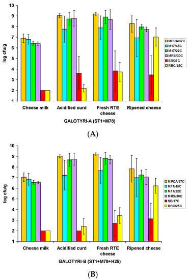 The growth patterns of total (starter and native) microbiota (TVC; MPCA/37 °C), total thermophilic dairy (lactose-fermenting) LAB (M17/45 °C), total mesophilic dairy LAB (M17/22 °C), total mesophilic LAB (MRS/30 °C), enterococci (SB/37 °C), and yeasts (RBC/25 °C) across four critical processing and ripening steps of the artisanal Galotyri A (ST1+M78) and Galotyri B (ST1+M78+H25) cheese samples are shown in Figure 2A,B, respectively.