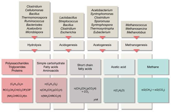 The role of the most common microorganisms in the anaerobic microbiota of a mesophilic biodigester. R, R′, and R″ are organic radical groups, while n and y denote the number of biomolecules or radicals of its composition [92,97].