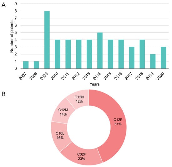 The top two most recurrent International Patent Classification (IPC) codes [147] were C12P (fermentation or enzyme-using processes to synthesize a desired chemical compound or composition or to separate optical isomers from a racemic mixture) with 51% of patent documents, and C02F (treatment of water, wastewater, sewage, or sludge), found in 23% of patent documents. Other patent classification codes were C10L (fuels not otherwise provided for; natural gas; synthetic natural gas obtained by processes not covered by subclasses) with 16%, C12M (apparatus for enzymology or microbiology) with 14%, and C12N (microorganisms or enzymes; compositions thereof; propagating, preserving, or maintaining microorganisms; mutation or genetic engineering; culture media) with 12%, among others (Figure 2B).