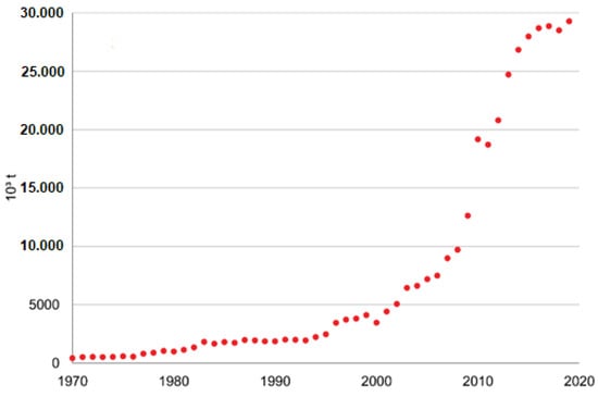 Since the 1970s, in Brazil, approaches have been adopted to increase circularity in sugarcane ethanol production plants. From this decade until the mid-1990s, the transformation of sugarcane bagasse into electric energy grew linearly and, from then on, exponentially (Figure 3). This co-generation strategy is the most significant measure towards a circular economy that allows production plants to become self-sufficient in energy. Other approaches highlighted by Raízen, one of the leading Brazilian ethanol-producing companies, were: strategies for water reuse, e.g., efficient recovery of condensates; the use of ashes from burning bagasse as fertilizer in the field, together with vinasse and filter cake; and the conversion of sugarcane bagasse and straw to second-generation ethanol, which reduces the carbon footprint by 35% [169].
