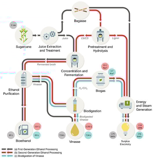 Analysis tools, such as modeling, simulation, and optimization, can aid in increasing the process’s yield and productivity, reduce capital and operational costs, and improve the management and conservation of energy resources to reduce greenhouse gas emissions. Life cycle analysis (LCA) is a technique used to minimize environmental problems, evaluating the impacts from raw material production to product consumption based on the input and output of materials and energy [168]. These analyses are fundamental to determining an ideal biorefinery configuration, such as sugar and ethanol plants that convert the feedstock into sugar, ethanol, steam, and electricity [16].