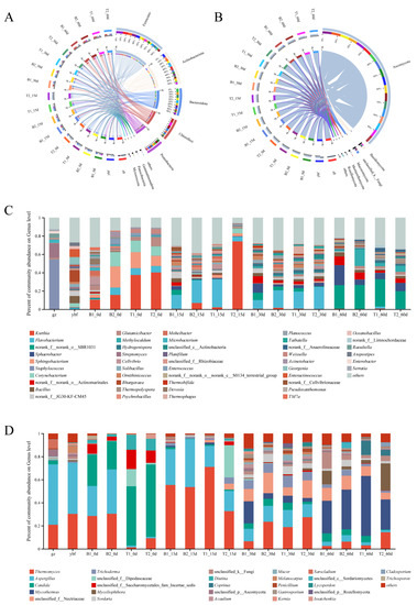 The relative abundance of bacteria at the phylum level (A), at the genus level (B), and fungi at the phylum level (C), at the genus level (D) among all samples. Taxa with abundance < 0.01% at the phylum level are classified as “other”, while taxa with abundance < 0.02% at the genus level are classified as “other”. B1, Vmushroom residue:Vsheep manure = 5:1, with CMA inoculation; B2, Vmushroom residue:Vsheep manure = 5:1, without inoculation; T1, Vmushroom residue:Vsheep manure = 9:1, with CMA inoculation; T2, Vmushroom residue:Vsheep manure = 9:1, without inoculation.
