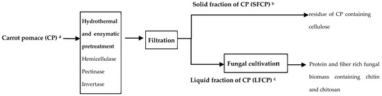 The carrot pomace was kindly provided by Herrlijunga Cider AB (Herrlijunga, Sweden) after the juice extraction process. It was stored in a freezer at −18 °C until use. The zygomycete fungus R. delemar CBS 145, 940 was obtained from the Centraalbureau voor Schimmelcultutres (Westerdijk Institute, Utrecht, The Netherlands), which was originally isolated from banana leaves used in tempeh production [16]. Yeast extract, agar, hydrochloric acid (HCl), sodium hydroxide (NaOH), sodium carbonate (Na2CO3), sulfuric acid (H2SO4), peptone, glucose, hemicellulase from Aspergillus niger, pectinase from Aspergillus, and invertase from baker’s yeast (Saccharomyces. cerevisiae) were purchased from Sigma Aldrich (St. Louis, MO, USA).