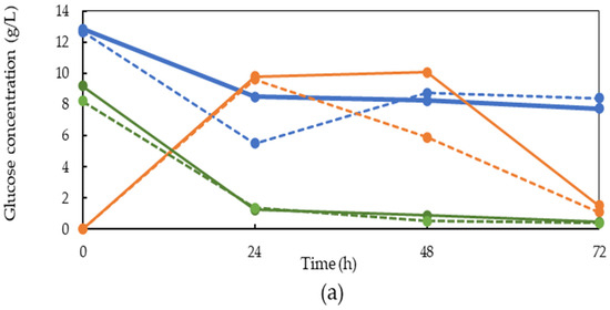 The glucose and sugar mix profiles obtained after the pectinase pretreatment were different to those obtained after the pretreatments with the other enzymes. While the glucose and sugar mix concentrations were nearly zero at the beginning of the cultivation, the glucose concentration reached 9.6 g/L within 24 h of cultivation. The sugar mix concentration was zero until 24 h and increased to 5.13 g/L after 48 h. This was due to the hydrolysis of the soluble carbohydrates by the fungal enzymes. The fungus was able to consume nearly all the glucose during the second and third days. The sugar mix concentration was reduced to 3.3 g/l during the third day of cultivation. Glucose consumption was quicker in the presence of the yeast extract, which is an indication of higher cell activity. For this pretreatment, the ethanol concentration passed a peak at 24 h and reached 10.2 and 9.4 g/L in the presence and absence of the yeast extract, respectively. The ethanol concentration was reduced during the second and third days of cultivation. Some previous studies have been conducted on the cultivation of fungi in carrot waste for bioethanol production [9,24,25,26]. In the previous investigations, the effect of different nitrogen sources on the bioethanol production by S. cerevisiae was conducted using 120 g/L CP at pH 6 and 72 h, and 6.9 g/L of bioethanol and 0.2 g/L of yeast cells were obtained in the presence of (NH4)2SO4 as the nitrogen source [27].