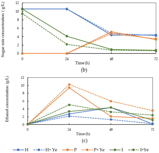 Glucose, sugar mix, and ethanol concentration profiles during fungal cultivation on LFCP obtained after the hemicellulase (H), pectinase (P), and invertase (I) pretreatments in the absence and presence of the yeast extract (Ye) in a 4.5 L bench-scale bubble column bioreactor during 72 h. (a) Glucose concentration (b) ethanol concentration, and (c) sugar mix concentration. The standard deviations were 0.01–2.3%.
