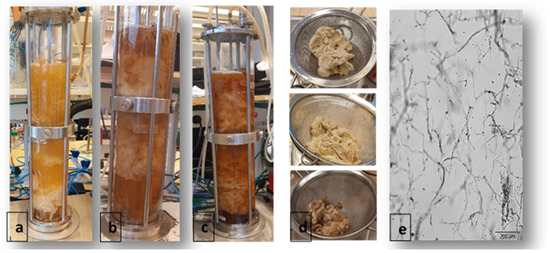 (a–c) Fungal cultivation in bubble column bioreactors using LFCP after the hemicellulase, pectinase, and invertase pretreatments, respectively; (d) harvested biomass from the hemicellulase (top), pectinase (middle), and invertase (bottom) pretreatments; (e) fungal mycelium obtained after the hemicellulase pretreatment (image was captured by oCelloScope).