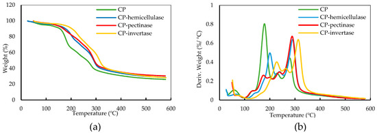 The thermal decomposition behavior of CP after each enzymatic pretreatment was investigated by TGA analysis with a Q500 TA instrument supplied by Waters LLC (New Castle, DE, USA). A total of 10 mg of freeze-dried CP or SFCP was heated from room temperature to 800 °C with a heating rate of 20 °C/min in a nitrogen atmosphere. Graphs on the percentage weight loss against the temperature were obtained and the thermal stability of the materials after the treatments was studied.